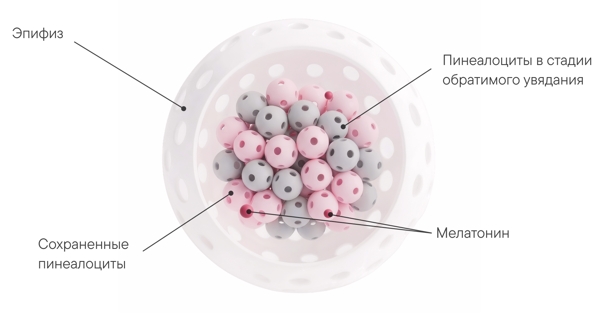 С возрастом снижается функциональная плотность пинеалоцитов, сопровождающаяся снижением секреции мелатонина