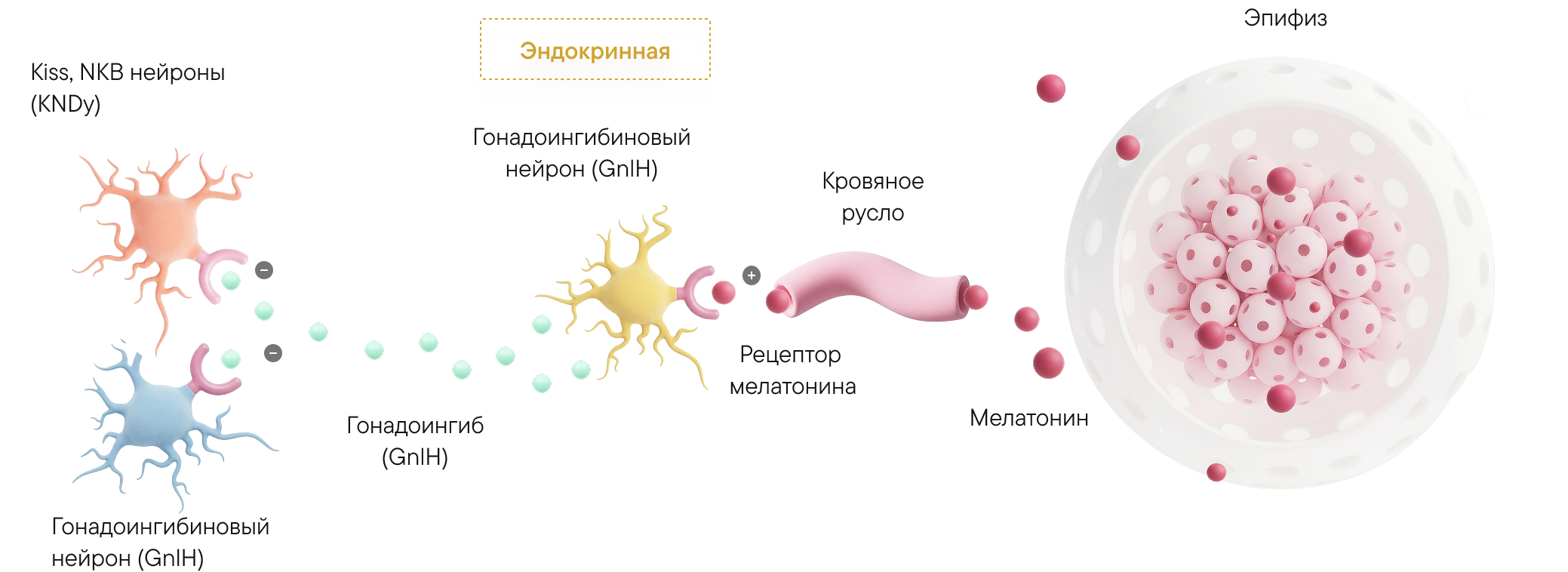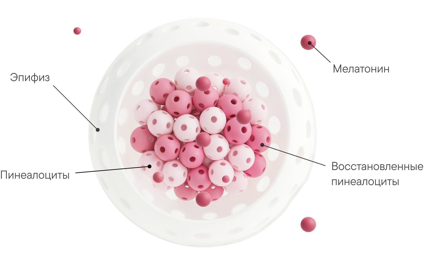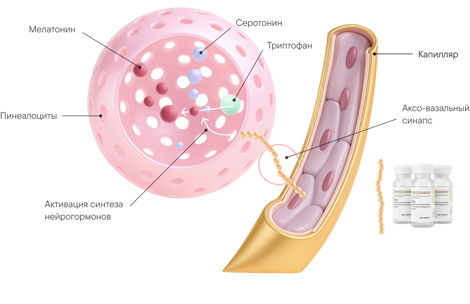 Тканеспецифичные/таргетные (к пинеалоцитам) полипептиды (PPG), минуя гематоэнцефалический барьер попадают внутрь пинеалоцитов через аксо-вазальные синапсы, где активируют синтез эндогенного мелатонина и серотонина
